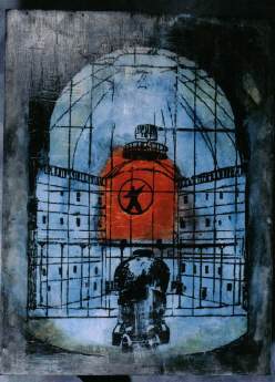 Came about after I completed The Gaze. I was left wondering about the prisoner. Michel Foucault traced the origins in Discipline and Punish at how punishment has changed and cycled throughout history. Body and Soul is based on the idea of the prisoner left alone to “rehabilitate” themselves as well as surveillance. What does the prisoner hope for? Salvation or death? One can only guess. Used materials: toner, acrylic, gel Medium on masonite.